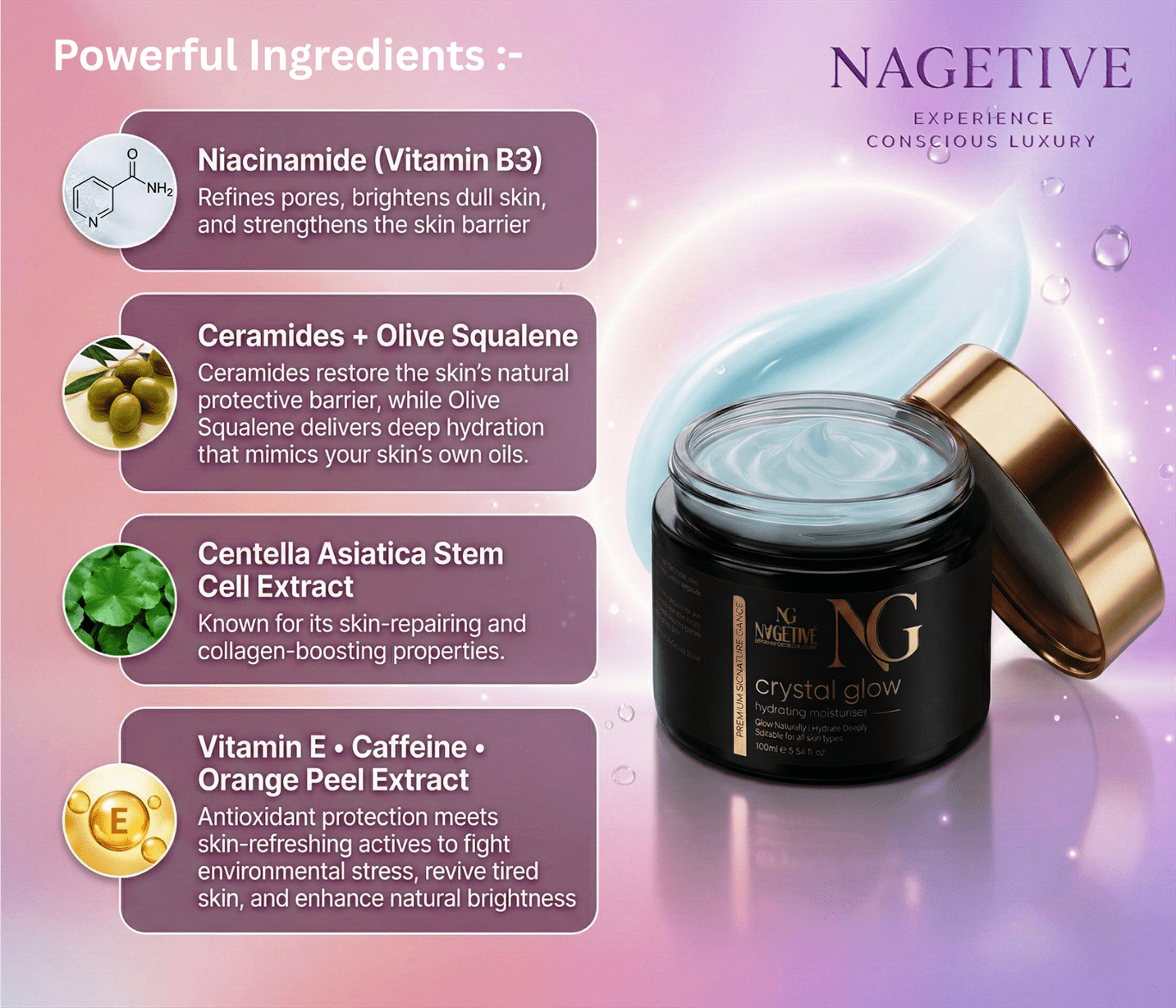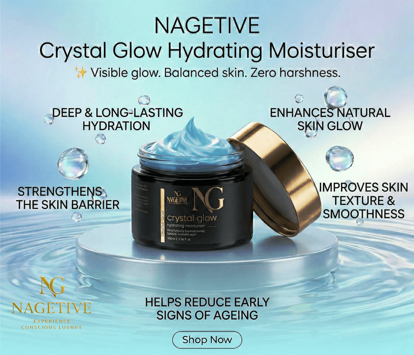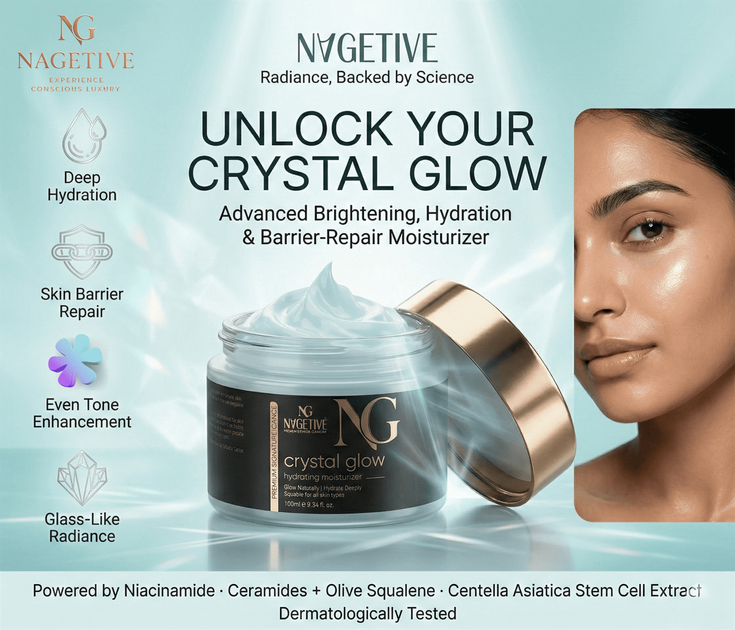 Enriched with a synergistic blend of botanical extracts, essential oils, vitamins, and skin-repairing actives, NAGETIVE Crystal Glow Hydrating Moisturizer delivers deep hydration, radiant glow, and long-lasting skin barrier protection.