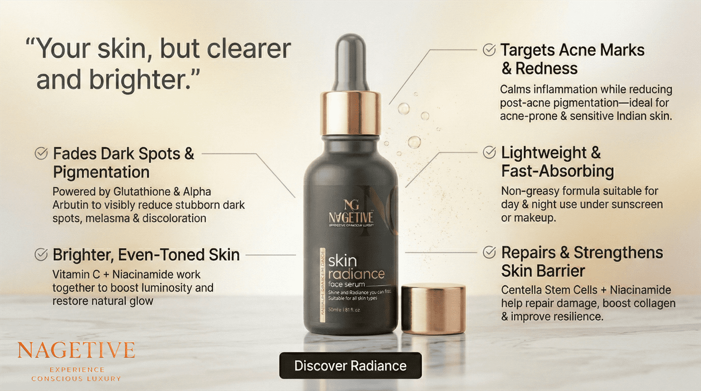 Nagetive Skin Radiance Face Serum is a Clean Beauty, clinical-grade glow formula designed to treat pigmentation, dullness, acne marks, and uneven skin tone at the root level.