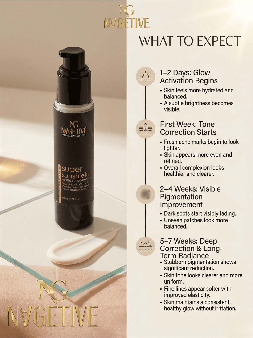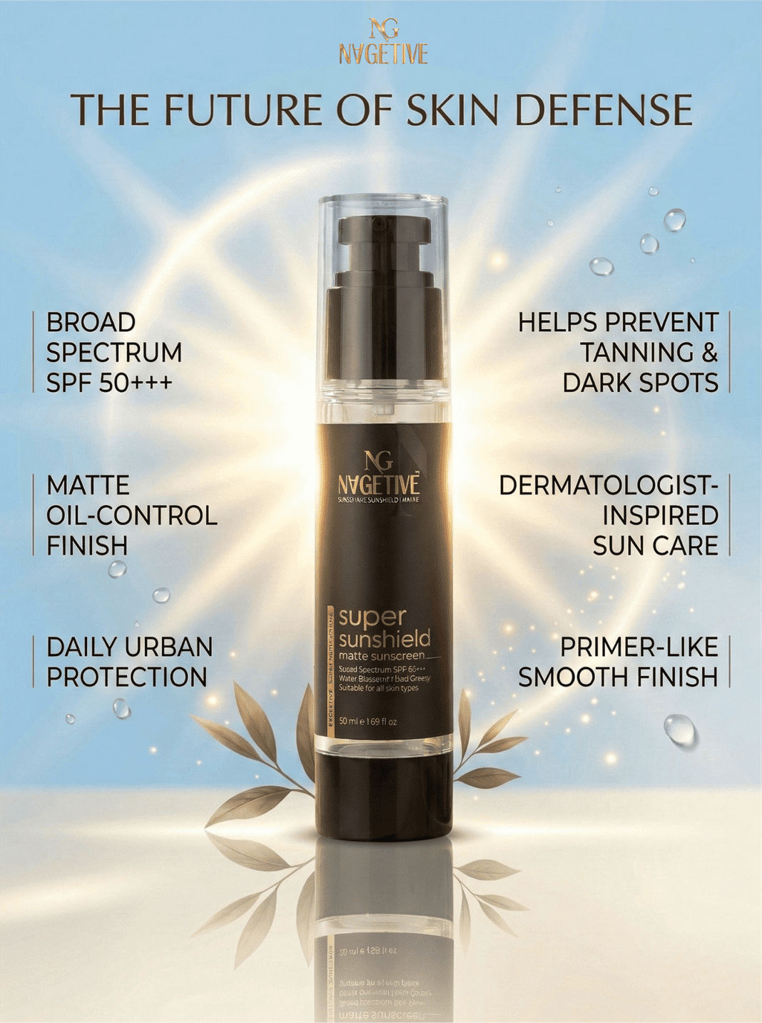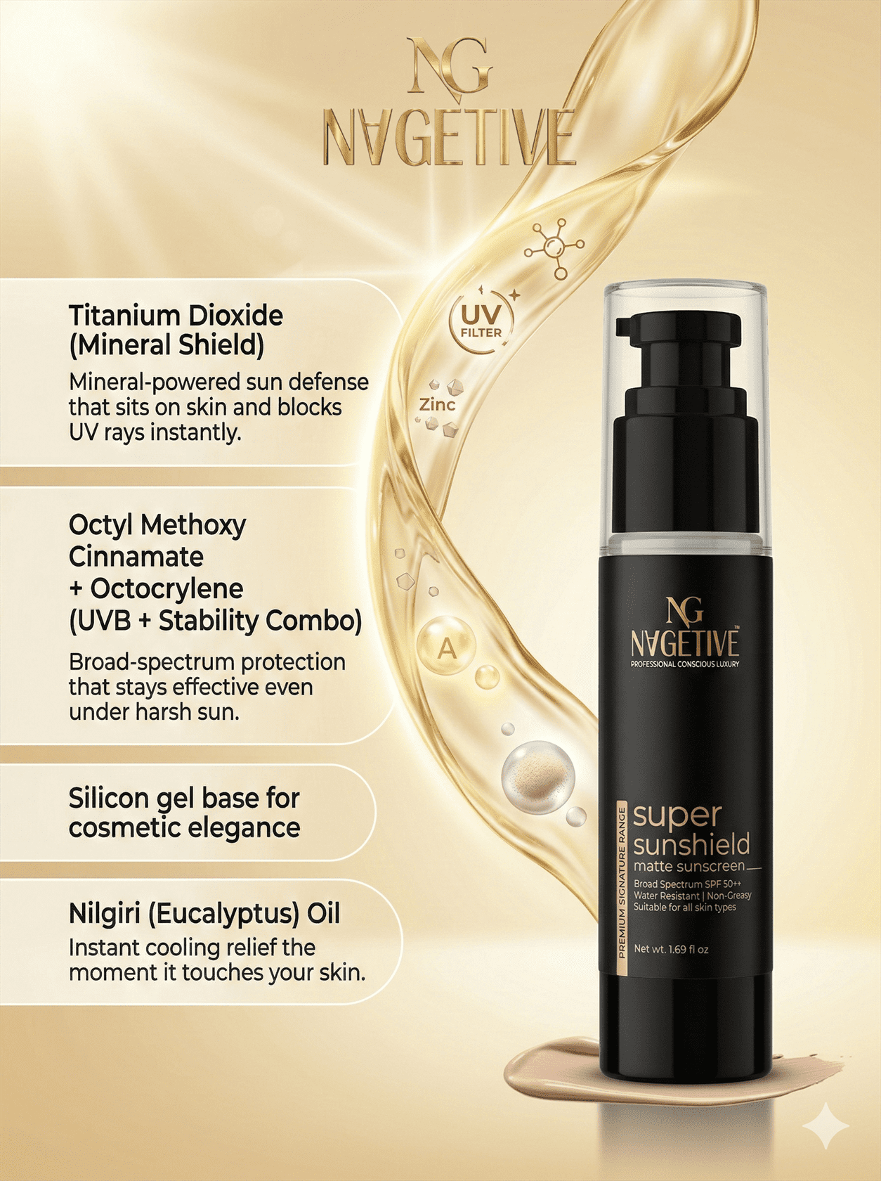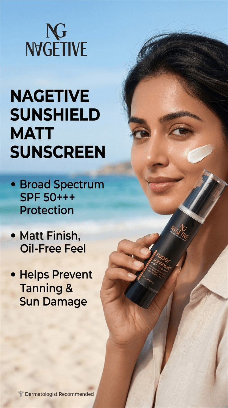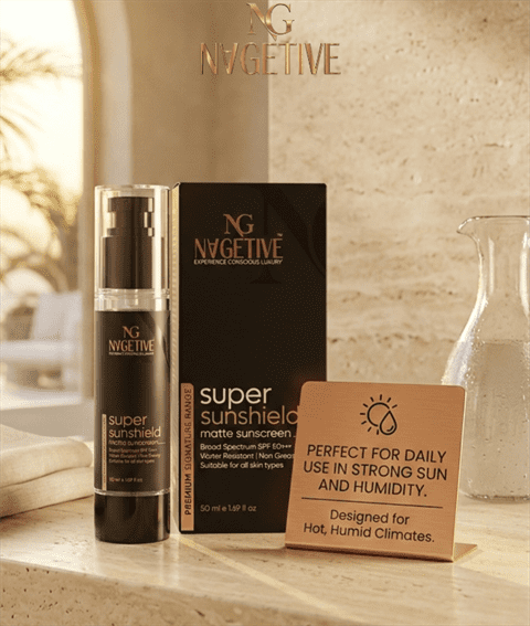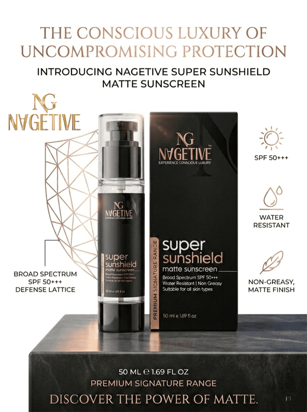 Powered with a balanced blend of advanced UV filters and nourishing natural oils, NAGETIVE Super Sunshield Matt Sunscreen offers broad-spectrum protection, skin nourishment, and a flawless matte finish.